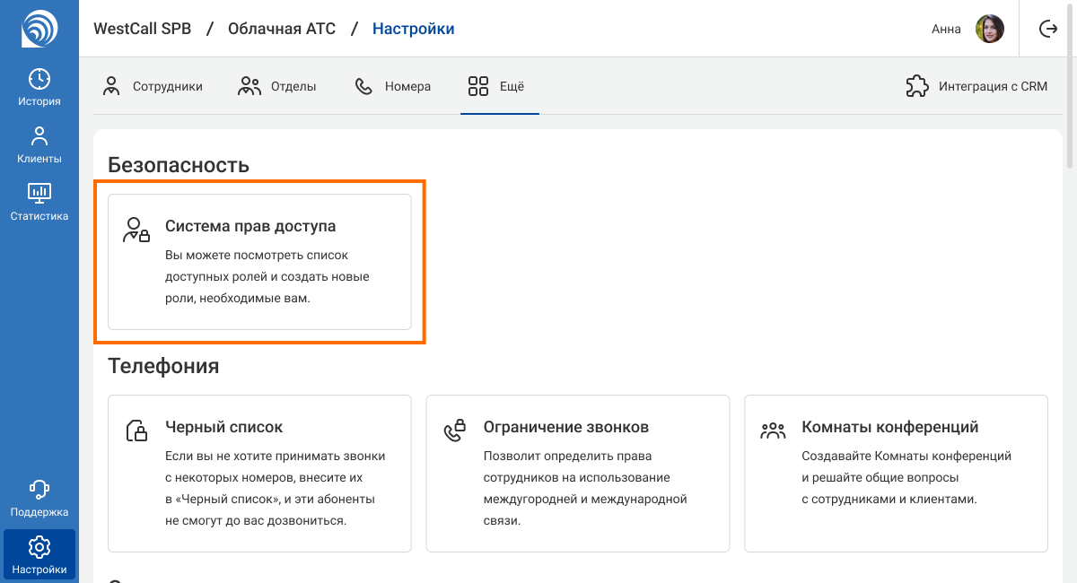 Чтобы посмотреть возможности ролей или изменить их, в настройках АТС перейдите на вкладку «Еще». В разделе «Безопасность» кликните на блок «Система прав доступа».