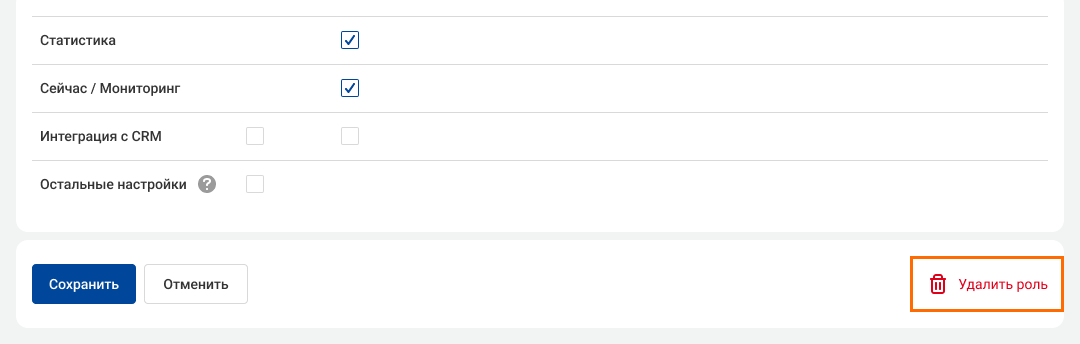 • Интеграция с CRM — можно настроить доступ для просмотра или редактирования настроек интеграций CRM.
