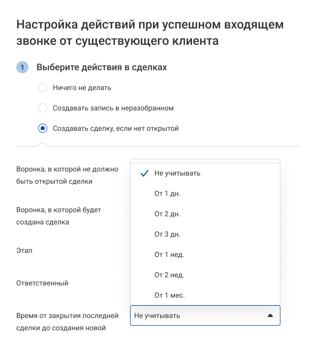 Чтобы не удалять дубли вручную, настройте период ожидания после закрытия сделки — если в это время позвонит тот же клиент, то дубль не появится в CRM.