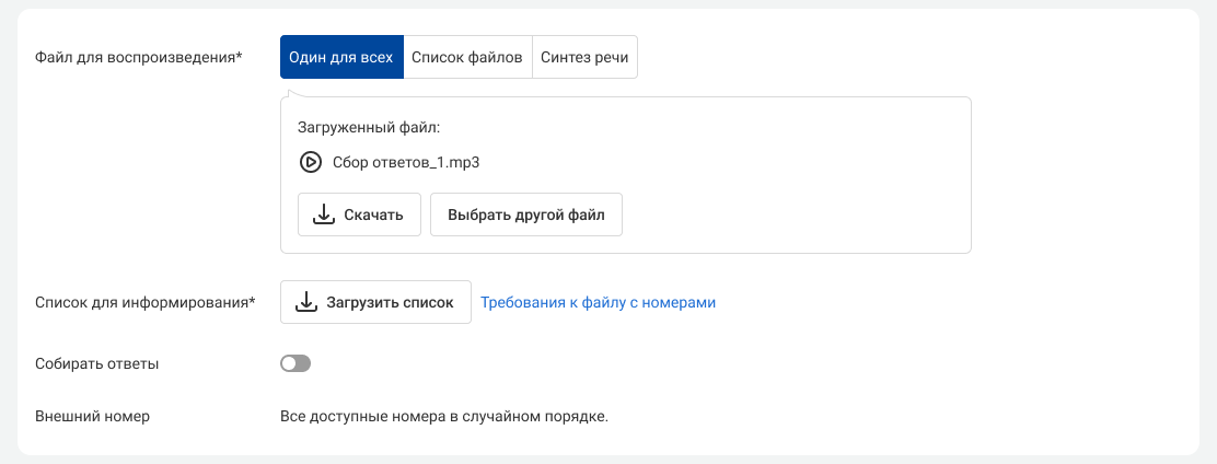 Если вы хотите использовать разные аудиофайлы для разных клиентов, загрузите архив с необходимыми аудиофайлами и файлом формата .csv, .xls или .xlsx. Укажите в архиве, какой файл нужно проиграть для каждого конкретного номера, при этом: