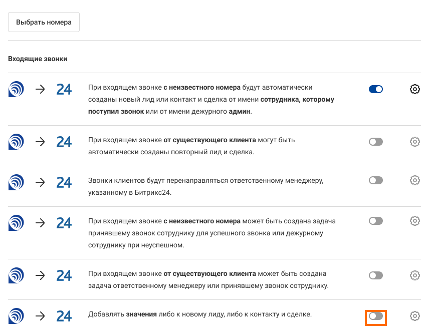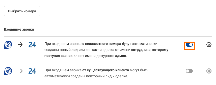 1. В интерфейсе АТС перейдите в: «Настройки» — «Интеграция с CRM» — «Интеграция с Битрикс24» — сценарии интеграции для входящих звонков. 2. Включите автоматическое создание лидов, контактов и сделок в интерфейсе АТС.
