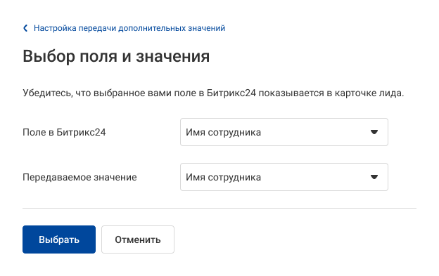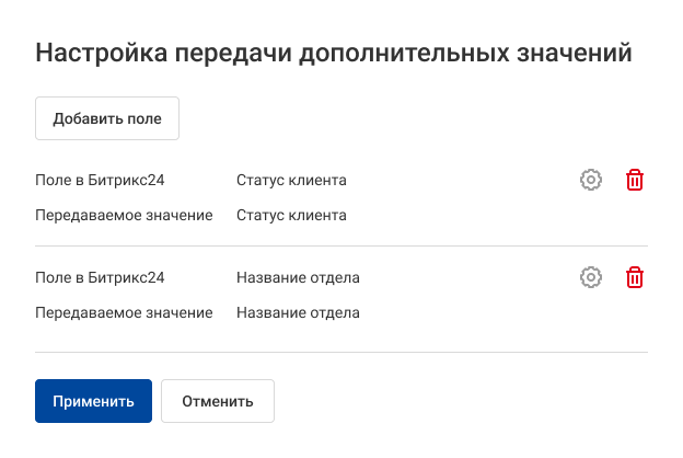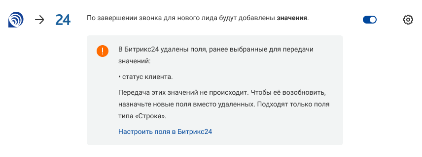 Чтобы возобновить передачу данных, добавьте поле в Битрикс24 и заново сопоставьте его в АТС с нужным значением.