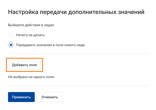 Чтобы новые поля отображались в карточке лида:1. Найдите в карточке раздел с информацией о лиде и нажмите «Выбрать поле».