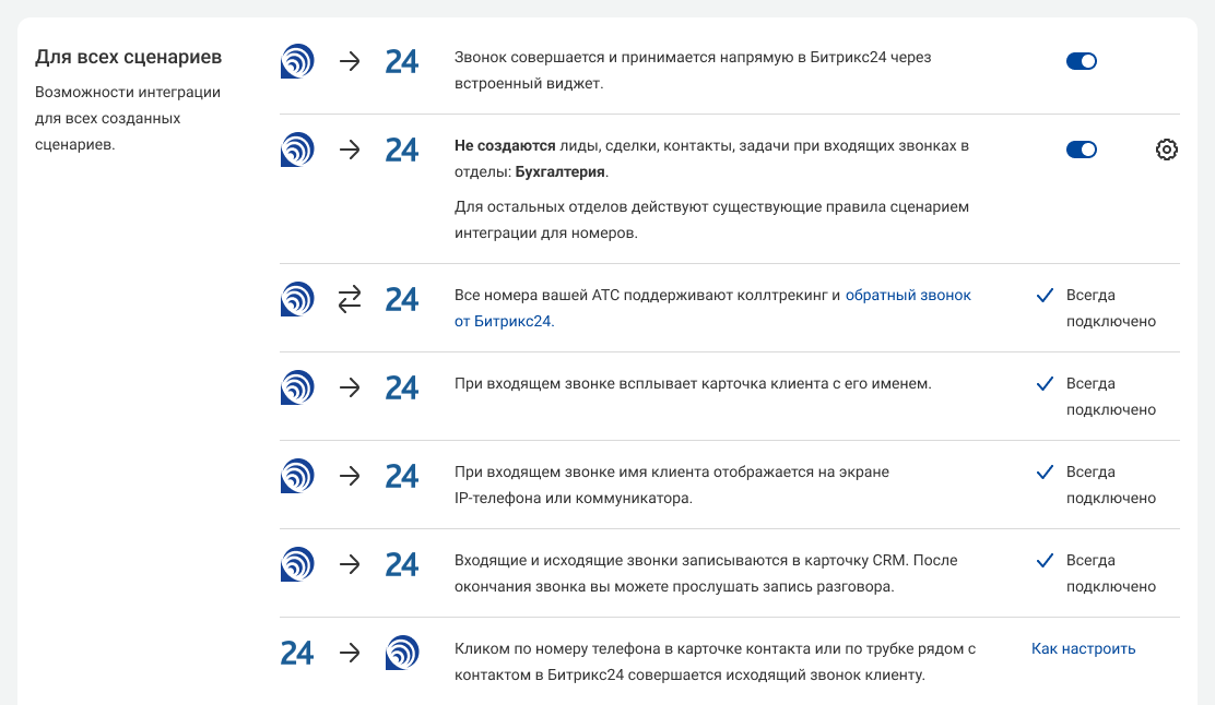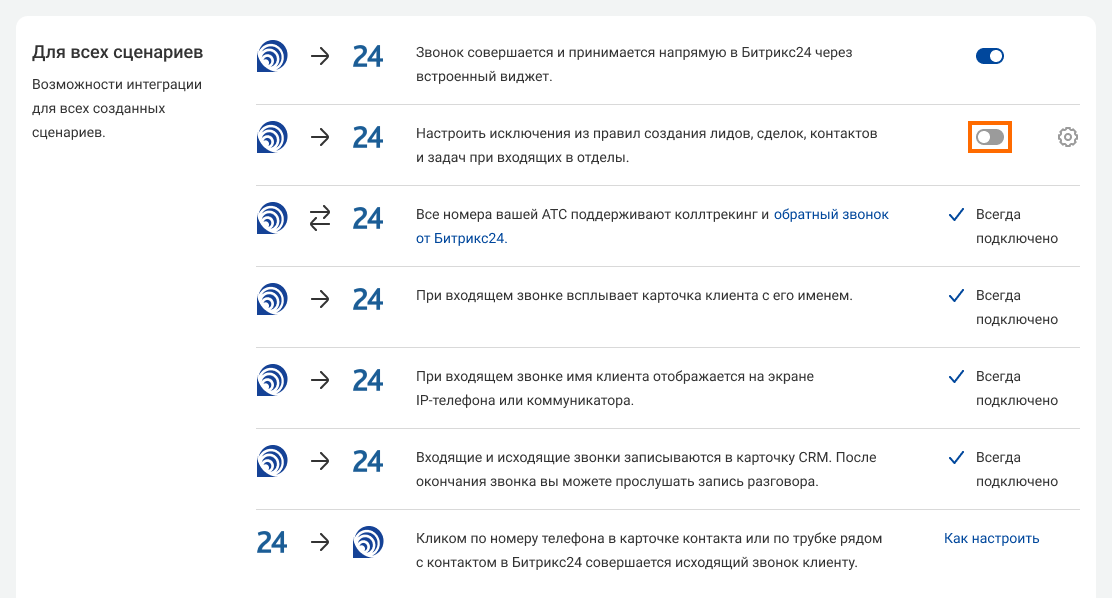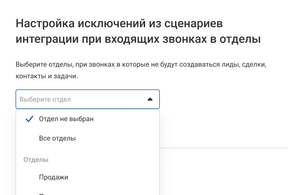 Если у вас настроен единый сценарий интеграции с Битрикс24 для всех номеров и при входящих в отделы создаются лиды, сделки, контакты и задачи, то вы можете настроить исключения из общего сценария для тех отделов, которые не пользуются CRM. Например, сделать так, чтобы при звонке на внутренний номер бухгалтерии никаких новых сущностей в CRM не создавалось. Далее мы расскажем, как это сделать.