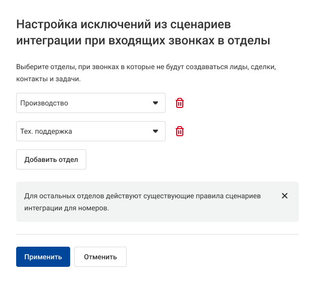 Откроется окно, в котором вы можете настроить исключения из сценариев интеграции при входящих звонках в отделы.