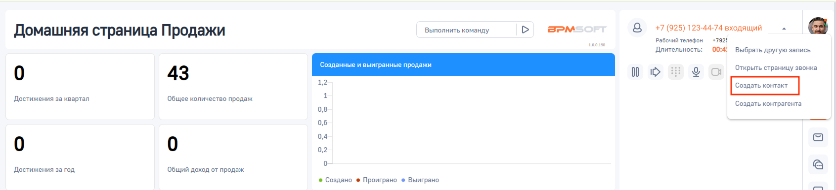 Если номер еще не был занесен в базу клиентов, вы можете сразу создать контакт.