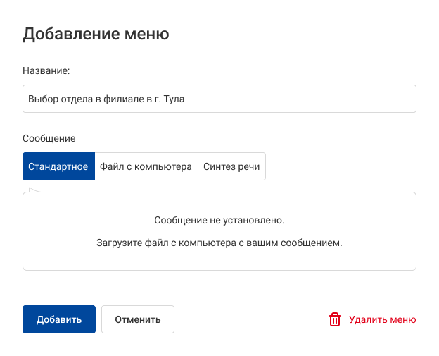 4. Голосовое приветствие настраивается отдельно для каждого уровня меню. Выберите приветствие для второго уровня меню и нажмите «Добавить».