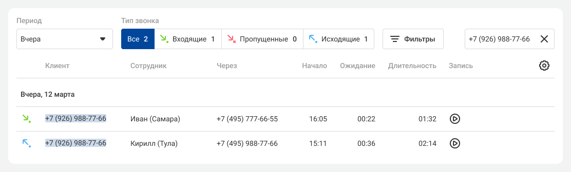 Теперь звонки вашего отдела, которые принял или совершил менеджер из другой АТС, будут отображаться в Истории → Внешние звонки, и их записи можно будет прослушать. В колонке «Сотрудник» в скобках будет указано название филиала, к которому относится менеджер, а в колонке «Через» — номер Виртуальной АТС, в которой настроен отдел с этим менеджером.
