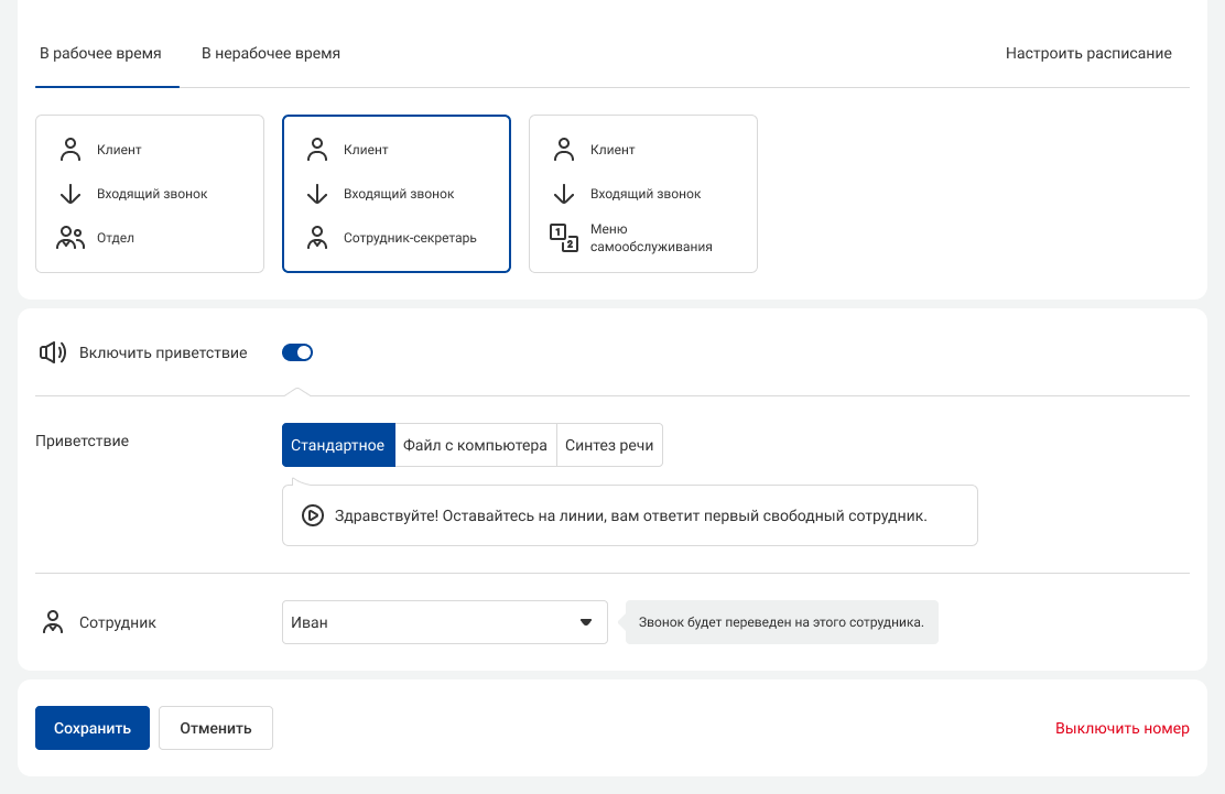 1. В настройках номера выберите режим работы «По расписанию» и перейдите на вкладку «В рабочее время». Выберите сценарий «Клиент – Входящий звонок – Сотрудник-секретарь».