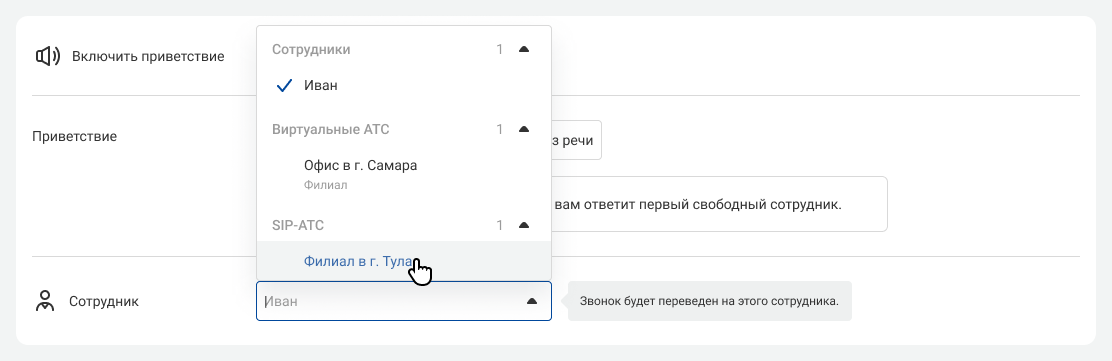 - Если это Виртуальная АТС, то выберите сотрудника в раскрывающемся списке.