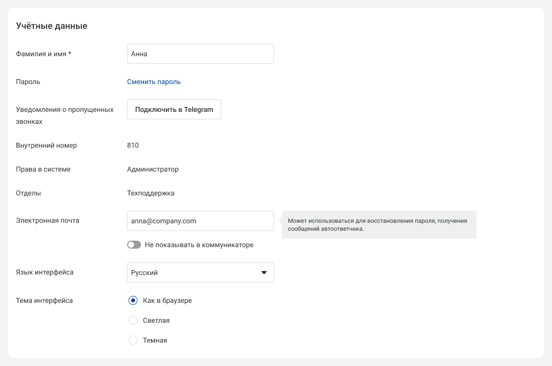 А также здесь указаны ваш внутренний номер, уровень прав в системе и то, как у вас настроены уведомления о пропущенных звонках.