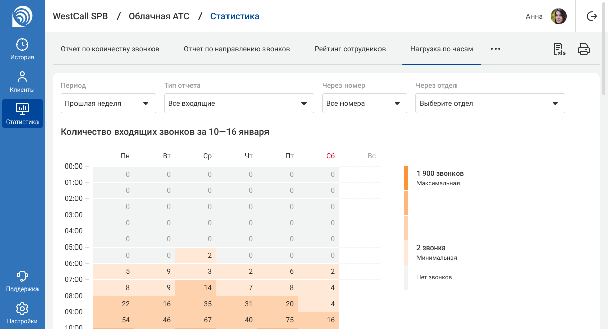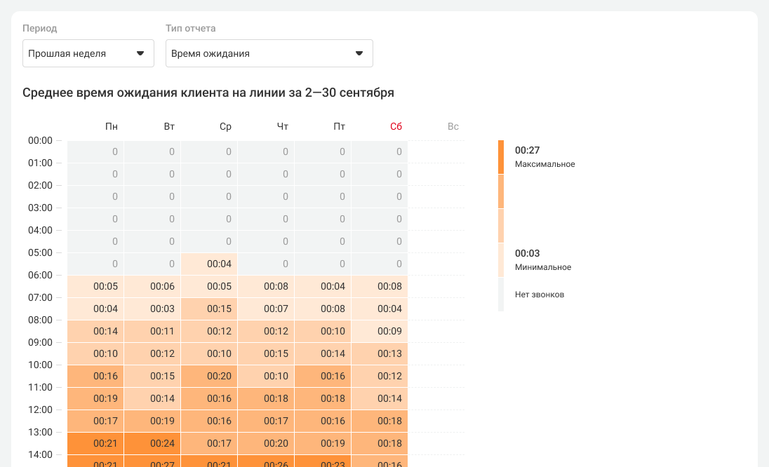 Отчет «Нагрузка по часам» показывает, в какое время и в какие дни недели сотрудники чаще и дольше всего общаются с клиентами.