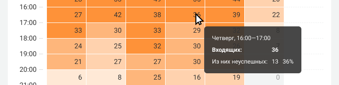 3. По неуспешным исходящим поймете, в какое время клиенты реже берут трубку и когда эффективнее их обзванивать. Для объективности учитывайте не только число неуспешных исходящих, но и их долю среди всех исходящих в выбранный час. Чтобы узнать долю неуспешных звонков среди всех исходящих, откройте отчет по всем исходящим и наведите курсор на любую ячейку.