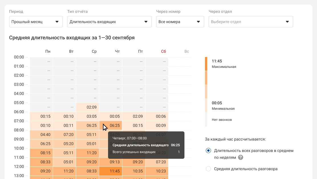 - Длительность всех разговоров в среднем по неделям — это средняя суммарная длительность входящих в этот час в выбранном периоде. Значение ячейки «Чт с 9:00 до 10:00» в таком случае будет рассчитываться иначе: