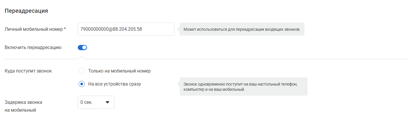 Для каждого сотрудника, помимо стандартных настроек, необходимо выполнить переадресацию на SIP URI Ringostat в формате: номер@88.204.205.58. При этом так же необходимо установить галочки «Включить переадресацию» и «Только на мобильный номер».