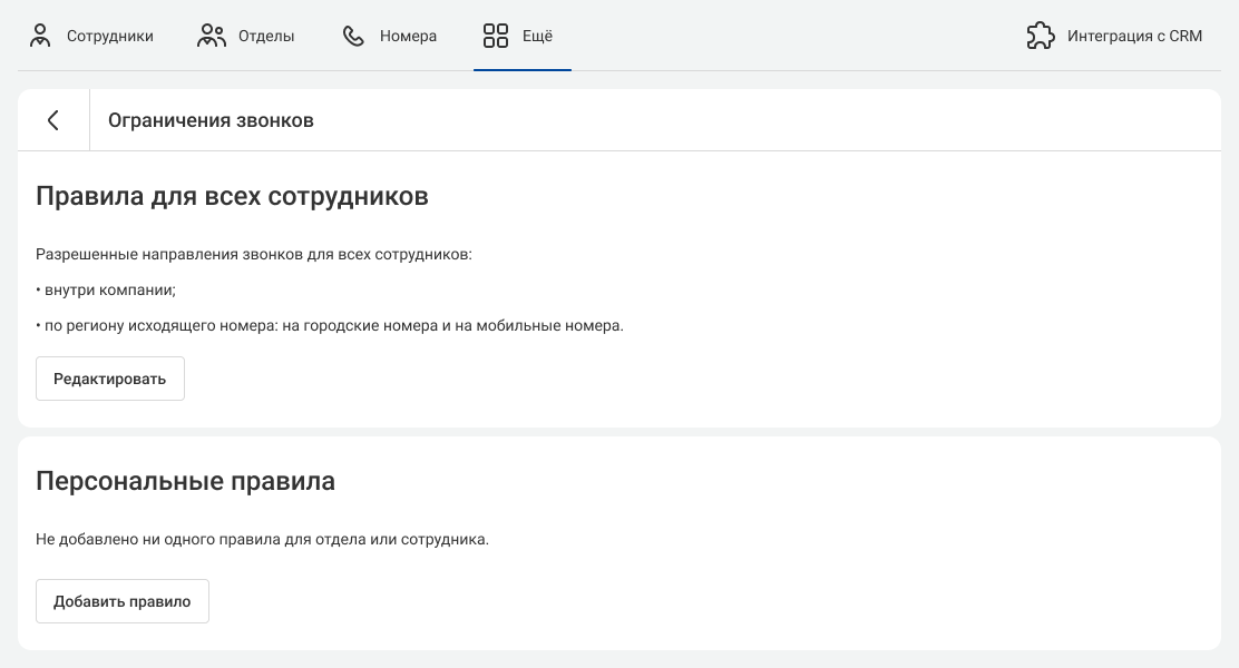 С помощью этих правил вы можете разрешить сотрудникам совершать звонки по определенным направлениям или запретить все исходящие вызовы, кроме внутренних и по региону номера.