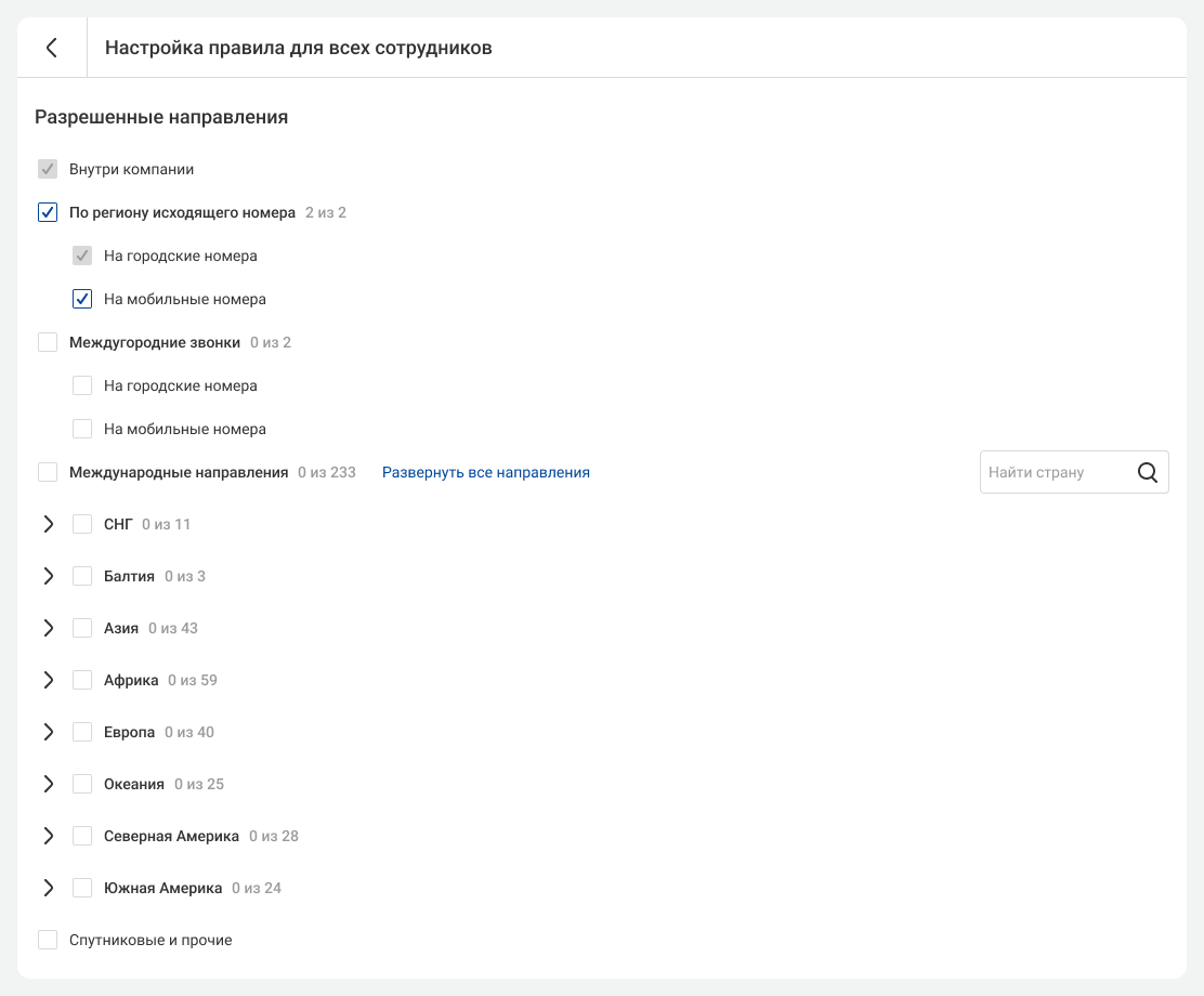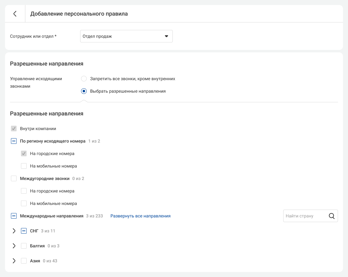 Выберите направления звонков, по которым сотрудники смогут совершать исходящие.