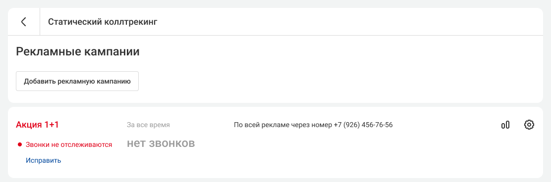 Если рекламная кампания настроена корректно, то в списке кампаний под ее названием отображается зеленый кружок. Если возник сбой в работе рекламной кампании, вы увидите красный кружок и соответствующий статус. Чтобы понять, что нужно сделать, чтобы звонки отслеживались, нажмите на «Исправить» под описанием проблемы.