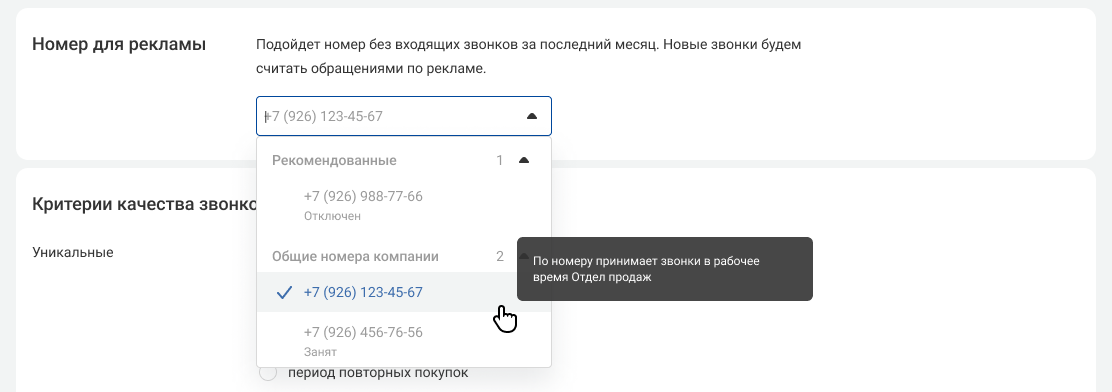 Вверху списка будут отображаться номера, на которые звонки не поступали в течение месяца. Мы рекомендуем использовать именно такие номера для коллтрекинга - это поможет получить более точную статистику по рекламе. Но, в целом, вы можете выбрать любой другой свободный номер. Если номер уже используется в другой рекламной кампании под ним будет указан статус «Занят».