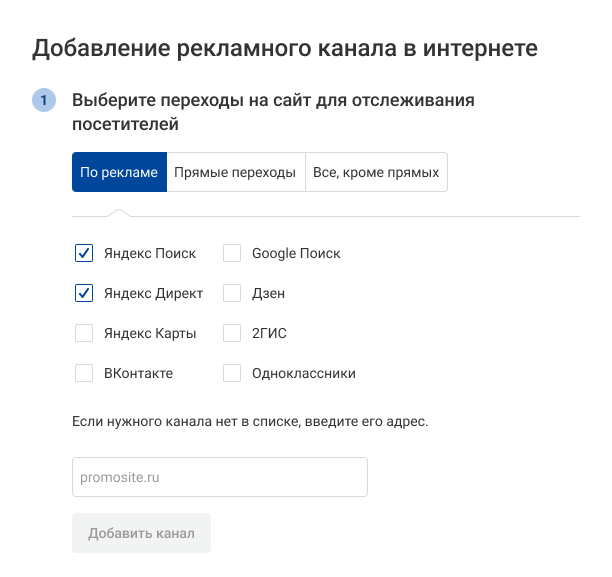 При выборе переходов по рекламе откроется список рекламных каналов. Выберите один или несколько каналов, переходы с которых хотите отслеживать с одного номера.