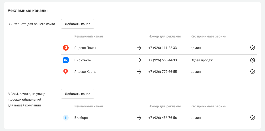 - с разделением по рекламным каналам через несколько номеров — для одновременного запуска рекламы через несколько каналов.